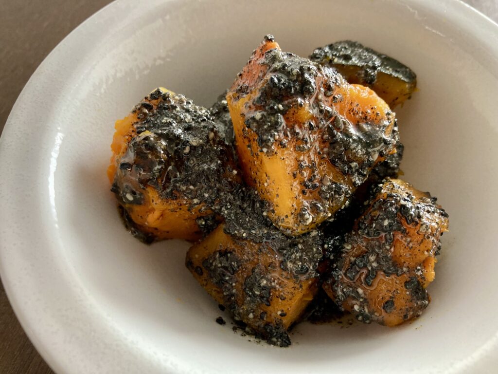 水、出汁、塩少しでカボチャを煮て、はちみつ、みりん、醤油少し、黒すり胡麻で作ったタレをかけました^^