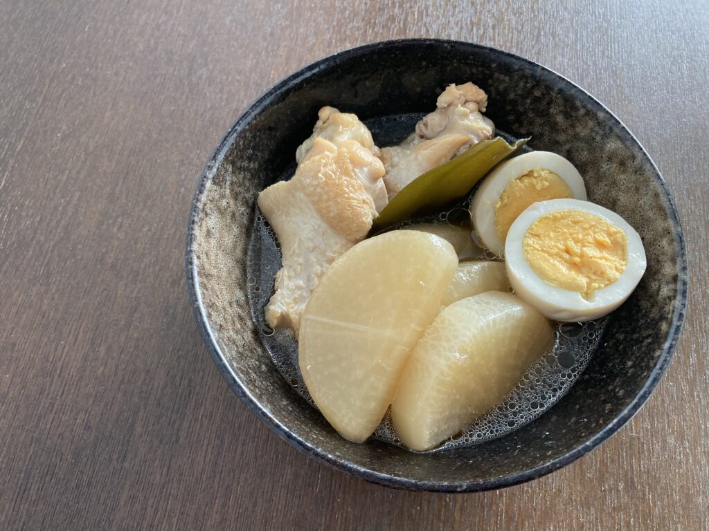 <鶏手羽元、昆布、大根、卵、生姜の煮物>