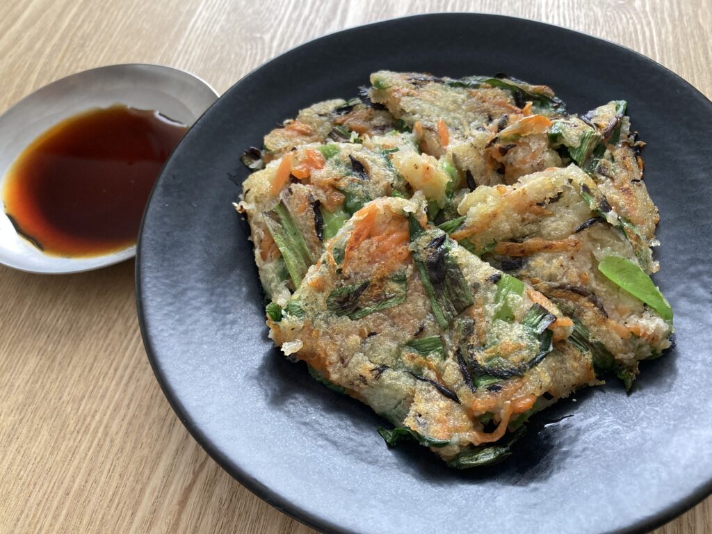 肝をサポートするにんじんとニラなどを使って、ごま油で焼いたチヂミを作ってみました!